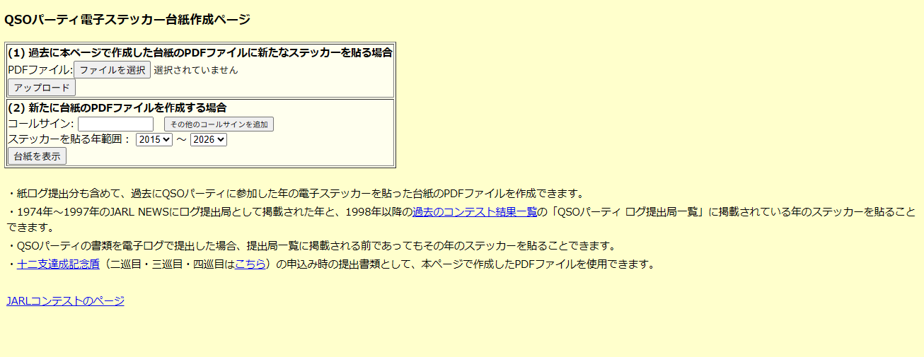 クリックすると、QSOパーティの台紙と、これまで参加したQSOパーティ年のステッカーが表示される。